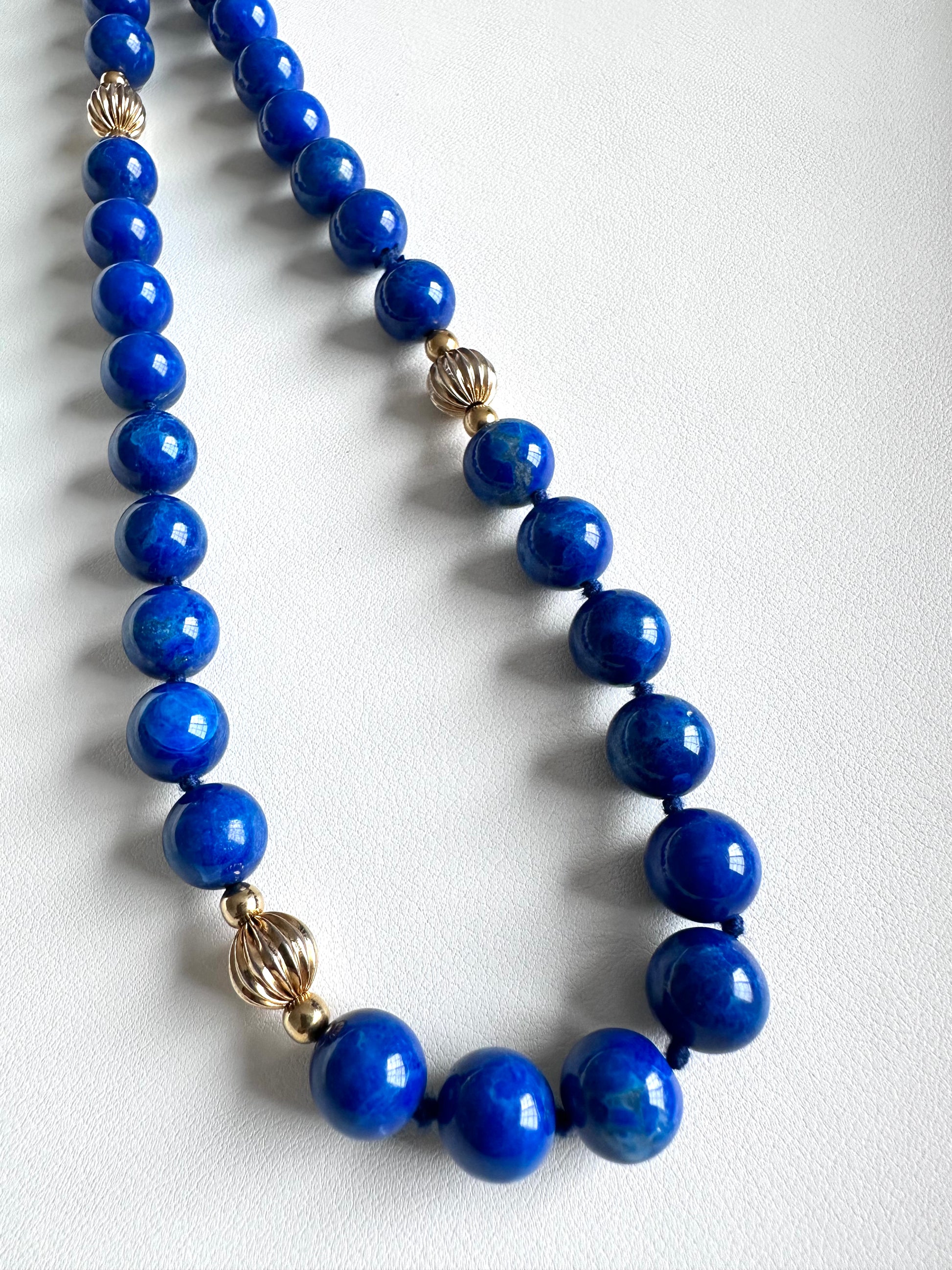 The vintage necklace containing 64 spherical, drilled lapis lazuli beads at approximately 10.10-10.20 mm each in diameter, eight fluted round 14 karat yellow gold beads at 8.40 mm in diameter, and 16 round 14 karat yellow gold beads at 3.75 mm in diameter. Necklace measure approximately 31 inches long, NO clasp.